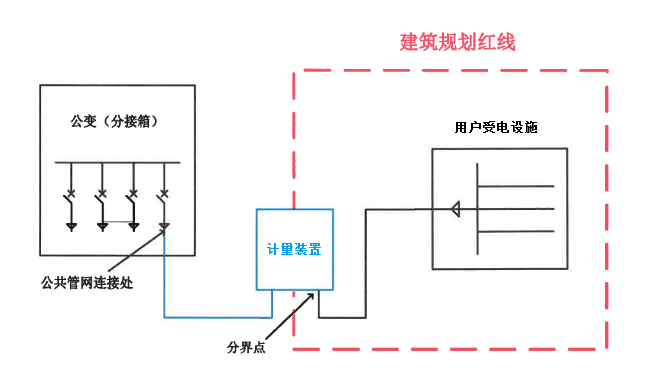 低压电力接入类项目:电力接入工程范围为计量箱至公共管网连接处的电力工程,以新上计量箱内电能表出线处为分界点,分界点电源侧供电设施属于电力接入工程范围,负荷侧受电设施由企业投资建设(不包含新建住宅小区、综合体项目中的用户)。示意图中蓝色部分代表电力接入工程范围,红色虚框代表建筑规划红线。