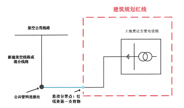 高压架空线路接入类项目:电力接入工程范围为建筑规划红线处第一支持物至公共管网连接处的所有电力工程。以红线处第一支持物上跌落保险或者分界断路器为分界点,分界点电源侧供电设施(含跌落保险或者分界断路器)属于电力接入工程范围,负荷侧受电设施由企业投资建设。示意图中蓝色部分代表电力接入工程范围,红色虚框代表建筑规划红线。