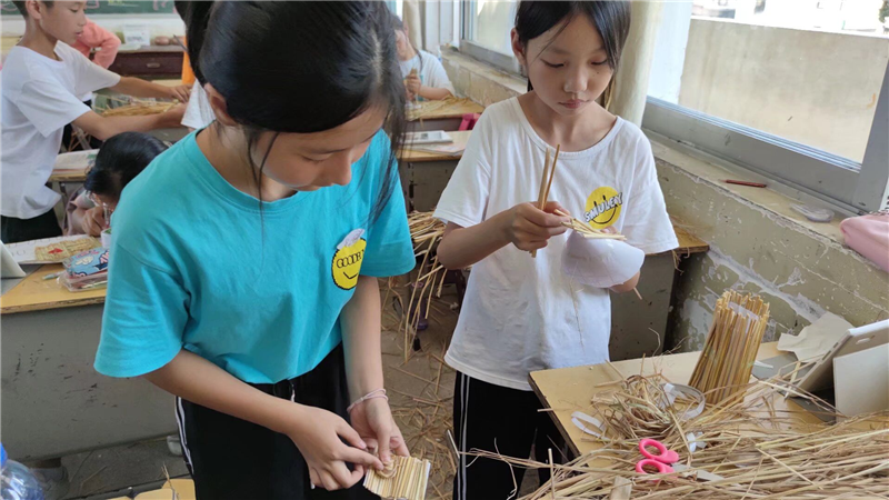 在课后服务的美术活动中,充分发掘农村资源优势,让孩子们提前准备好美术活动材料:如稻草、叶子、树枝、石头、泥巴等,在美术老师的示范指导下,孩子们兴致勃勃用自己捡来的树枝、稻草、石头等,比划着、思索着,迫不及待地投入到活动中,孩子们有的独立创作,有的小组合作,打磨树、涂染颜色、剪贴拼凑……一幅幅作品充满了童真童趣,造型奇特,创意不断,孩子们也乐在其中。