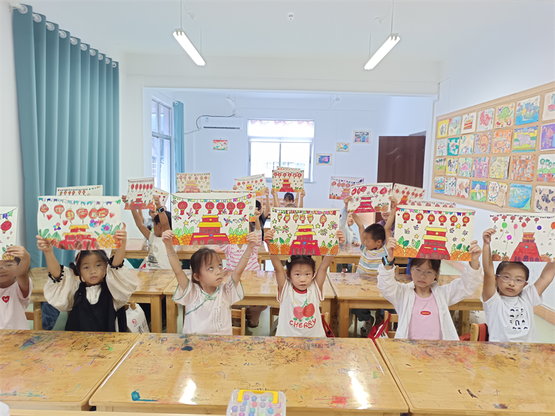 画画室内,孩子们的热情如同秋日的暖阳,充满了无限的活力。在老师的悉心指导下,小画家们围绕“迎中秋·庆国庆”的主题,大胆创作。画纸上,鲜艳的五星红旗迎风招展、壮丽的天安门城楼巍然屹立,表达着对祖国母亲最纯真的热爱与祝福,展现了孩子们心中对国家繁荣富强的自豪感以及对未来美好生活的向往。