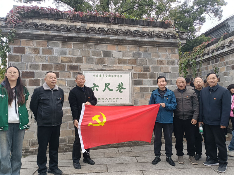 在讲解员的带领下,党员们实地探访了六尺巷遗址,了解清代张英家族“让他三尺又何妨”的礼让故事。斑驳的青石板与两侧的徽派建筑,生动展现了“和为贵”的处世哲学。党员们驻足凝视,深刻感悟“六尺巷”所承载的谦逊包容、顾全大局的精神内核。