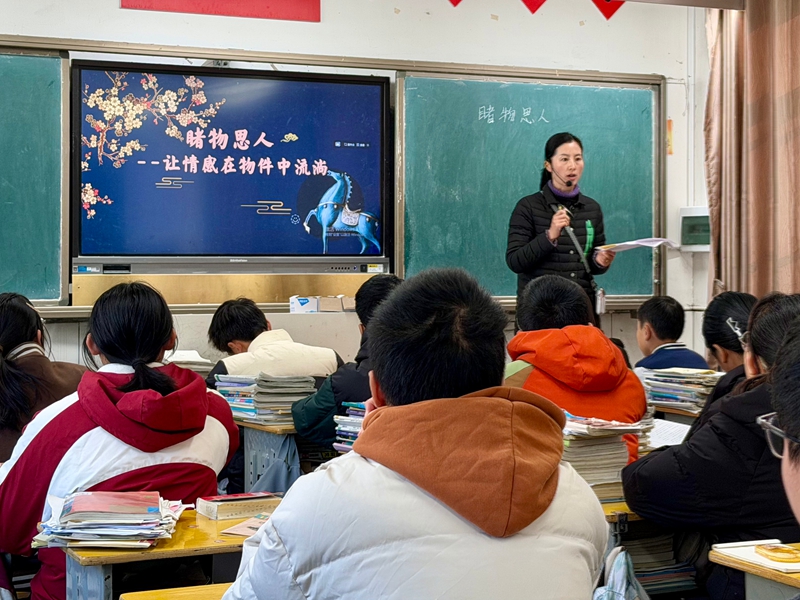 课堂示范,彰显育人温度。活动中,美溪初中方金枝老师执教《诫子书》(第二课时)以“静以修身,俭以养德”为主线,通过层层递进的诵读设计、情境引导与文化解读,带领学生深入体会诸葛亮家训中蕴含的人生哲理与精神境界。课堂注重文言文教学的“言”“文”并重,在语言积累的基础上实现情感共鸣与价值引领,充分体现了传统文化浸润式教学的魅力,为经典文本的教学提供了可复制、可推广的范例。江菊芳老师的写作指导课《睹物思人:让情感在物件中流淌》紧扣学生写作中的“无物可写、无情可抒”痛点,创新提出“选物—叙事—抒情”三阶训练法,借助贴近生活的实物案例和片段练笔,引导学生从日常物品中挖掘情感记忆,提升托物言志、借物抒情的表达能力。整节课结构清晰、互动频繁,学生作品真实感人,展现出扎实有效的写作教学新思路。
