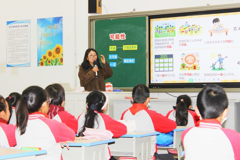 活动中,碧阳小学林永欢老师首先呈现研讨课《可能性》,通过精心设计的教学活动,引导学生深入理解概率概念。春江小学朱艳秋老师带来展示课《有趣的密铺》以小组合作拼摆实验的形式,探究正多边形、一般图形及不规则图形密铺情况。两节课均巧妙融入AI互动工具,使抽象的数学知识变得直观有趣,展现了技术赋能下课堂的新样态。