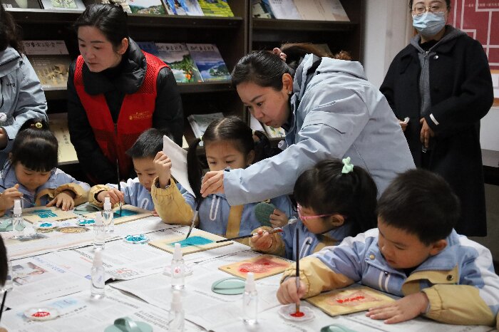 活动伊始,在博物馆专业讲解员的引导下,屯溪示范幼儿园的幼儿和教师代表率先走进“徽州艺术”展厅的“徽派版画”单元,开启了一场沉浸式文化探索之旅。讲解员结合幼儿认知特点,用生动通俗的语言介绍版画的色彩搭配、图案寓意及背后的徽州故事,引导孩子们细致观察版画的独特纹理与艺术细节,感受了传统艺术的魅力。随后的主题社教环节,博物馆志愿服务人员现场指导小朋友们开展版画拓印手工体验,孩子们在老师的协助下,小心翼翼地涂抹颜料、平稳按压,一张张带着童真创意的版画作品新鲜出炉,现场充满了欢声笑语,也让孩子们在动手实践中直观领略了徽派版画的制作乐趣。