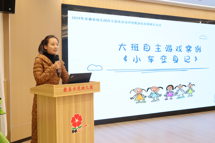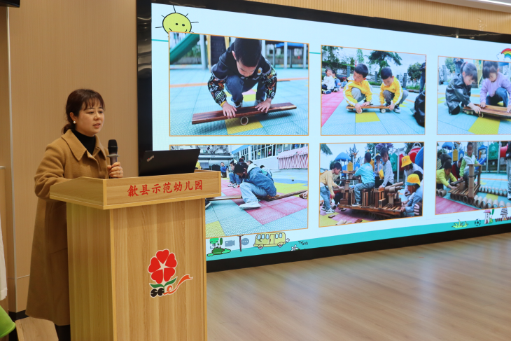 培训现场,歙县行知小学附属幼儿园方艳萍以《车来了》为切入点,系统呈现了在低结构材料支持下,如何通过教育机智支持幼儿持续探索解决游戏中的真实问题,实现深度学习。黄山市新城实验学校附属新城幼儿园豆妍妍以《小车变身计》为例,从环境创设、材料投放、观察指导等维度,系统讲解教师在自主游戏过程中如何扮演好支持者、合作者和引导者的角色,兼具理论高度与实操价值。