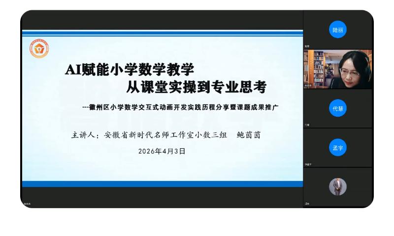 2026年4月3日,安徽省新时代名师名校长培养计划2024级第三组“AI赋能小学数学教学”线上联合教研活动成功举办,来自全省8个市17家名师工作室的百余名骨干教师齐聚云端,共探AI与小学数学教学深度融合的路径与方法。活动中,徽州区省级名师工作室主持人鲍茵茵受邀作专题分享,系统梳理并推广了徽州区五年来在小学数学数字化教学领域的实践成果与实操路径,提出了可落地、可复制的“徽州方案”,得到了全省参会教师的高度认可与广泛好评。