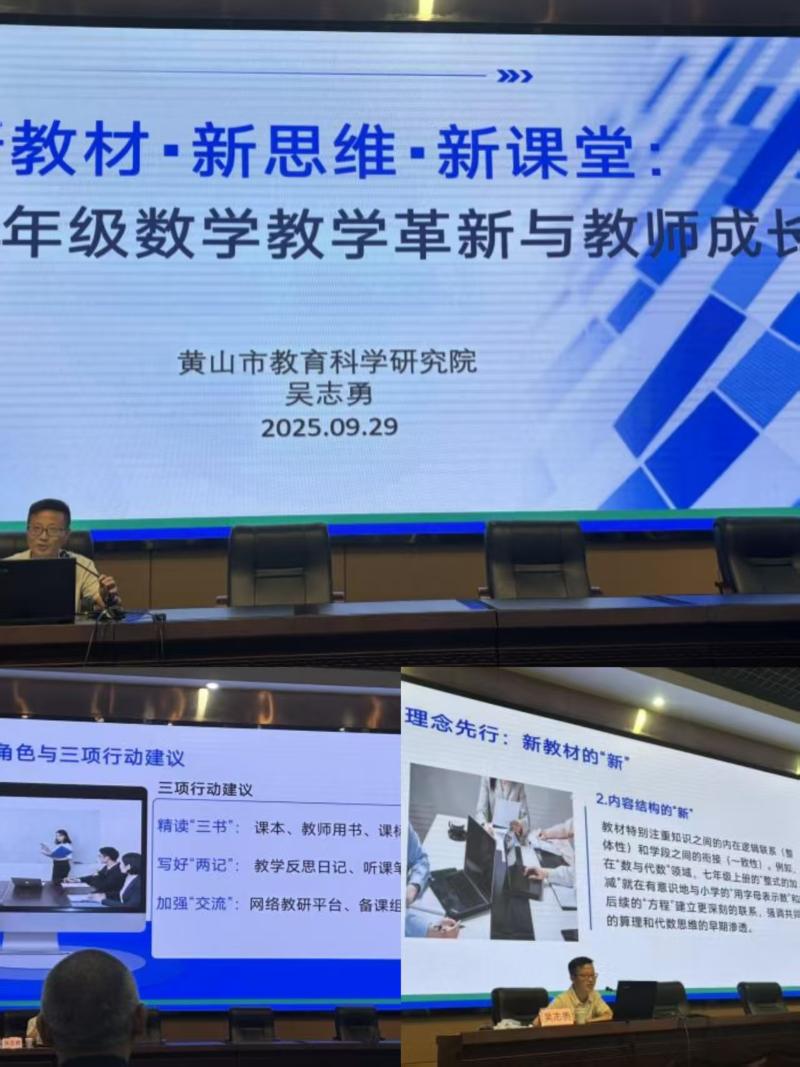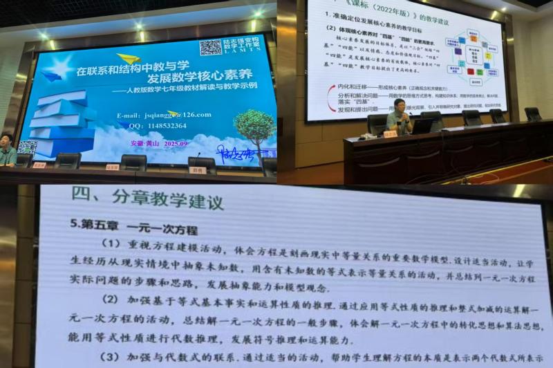 活动第二项,由黄山市教科院数学教研员吴志勇老师作专题报告《新教材·新思维·新课堂:七年级数学教学革新与教师成长》。报告从三大维度为我市初中数学教学革新与教师专业发展指明了方向。