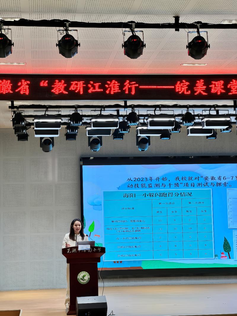 活动中,黄山市休宁县海阳第一小学体育教师黄奇代表黄山市教研团队作了《躲闪跑·新跨越——基本移动技能(躲闪跑)的干预策略》的专题分享。她的分享聚焦于该校在基本运动技能上的教学,特别是躲闪跑教学中的跨学科方法与精准干预策略,展示了扎实的教研功底与以生为本的教学温度,为全省体育同仁提供了成功的实践案例。