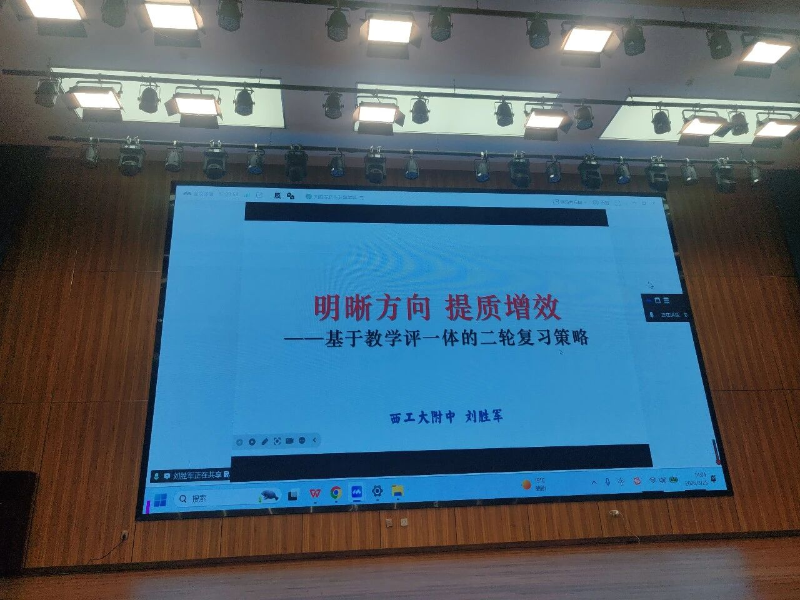 下午的活动环节,西北工业大学附属中学刘胜军老师以线上形式作《基于“教学评”一体的二轮复习策略》专题讲座。讲座紧扣当前二轮复习中的共性难题,从“学生如何有效学”与“教师如何精准教”两个维度出发,系统阐述了知识网络构建、关键能力提升、核心素养落地的实操策略,并分享了大量基于真实学情的教学设计案例,强调“以评促学、以评导教”在提升复习效能中的核心价值。