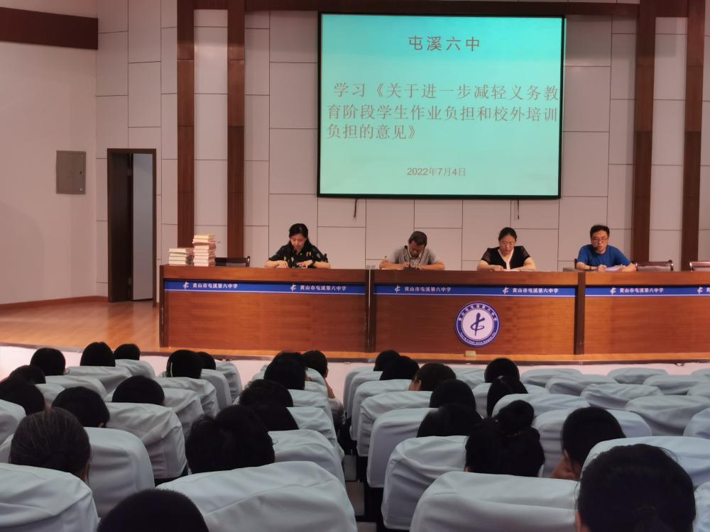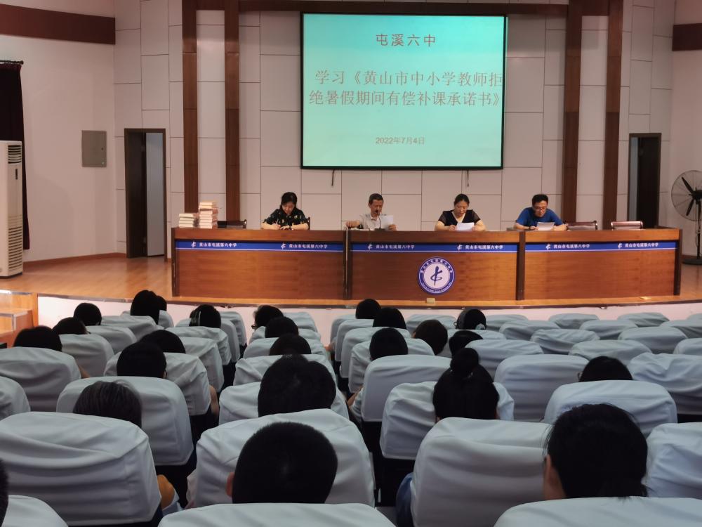 第二项议程由袁德明副书记对全体教师开展了师德师风师能建设年活动专题教育,要求大家要自觉加强师德师风师能建设,全体教师集中签订了《黄山市中小学教师拒绝暑假期间有偿补课承诺书》,组织教师学习《关于进一步减轻义务教育阶段学生作业负担和校外培训负担的意见》,切实转变教师的教育观念,有效改进教师的教学行为,提升教师的基本素质,减轻学生的课业负担,促进学生全面发展和健康成长。