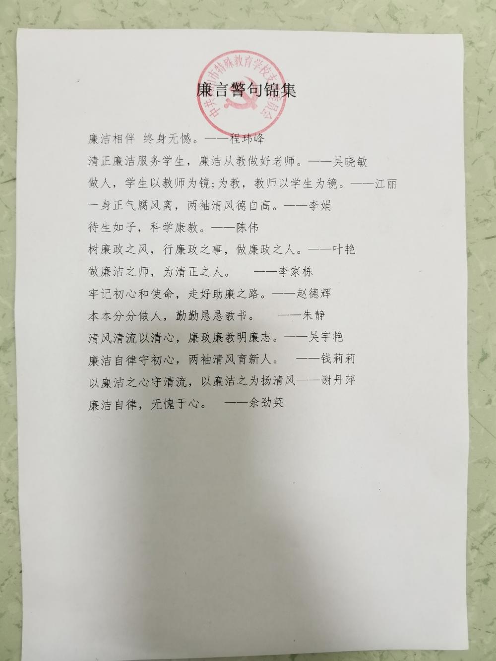征集原创廉言警句。由党支部牵头开展了原创廉言警句的征集活动。全体党员结合自己岗位和工作实际,撰写了“廉洁相伴,终身无憾”、“清风清流以清心,廉政廉教明廉志”等廉言警句,增强党员干部廉洁自律意识,营造了“人人思廉、人人倡廉、人人践廉”的良好氛围。