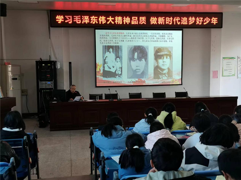 在讲座中,陈老通过详实的历史史料、生动鲜活的历史事例,声情并茂地给同学们讲述了一代伟人毛泽东在童年、少年、青年等时期的故事,向大家生动地展示了一代伟人毛泽东的成长历程和雄才大略,带领同学们学习了他的经典诗词等内容。讲座深入阐述了毛泽东智慧的精华。精彩的内容不仅让同学们进一步领略了伟大领袖毛主席的风采,陈老还引导同学们要立志高远,做有理想、敢担当、能吃苦、肯奋斗的新时代好少年。