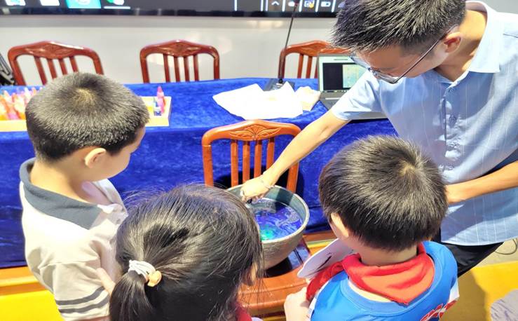 随后,姚斌现场演示漆扇的制作过程,学生们围在他的身边,认真观看,不时发出惊叹声,对这项古老而又神奇的技艺充满好奇与向往。接下来的体验环节,学生们在姚斌的指导下,分组进行漆扇制作。彩漆漂在水面上,形成发散的色块,极具生命感和随机性,一把把白色的扇子,浸入漂漆中,像被施加了魔法一样。一把把精美绝伦、绝无仅有的漆扇随即出现在孩子们面前:或是烟雨徽州,或是绮丽春光,也有金色田野、丰收晚景。望着自己亲手制作的漆扇,孩子们个个兴高采烈、无比自豪,切身感受了一次色彩流动的美学。