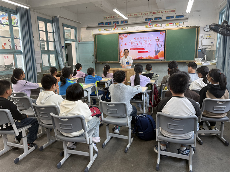 近日天气乍寒乍暖,学生穿衣饮食把控不好,容易引发感冒等传染病。为了避免学生患秋季传染病,10月15日下午,流口镇卫生院医护人员来到流口中心小学,向中高年级学生宣传传染病预防知识。