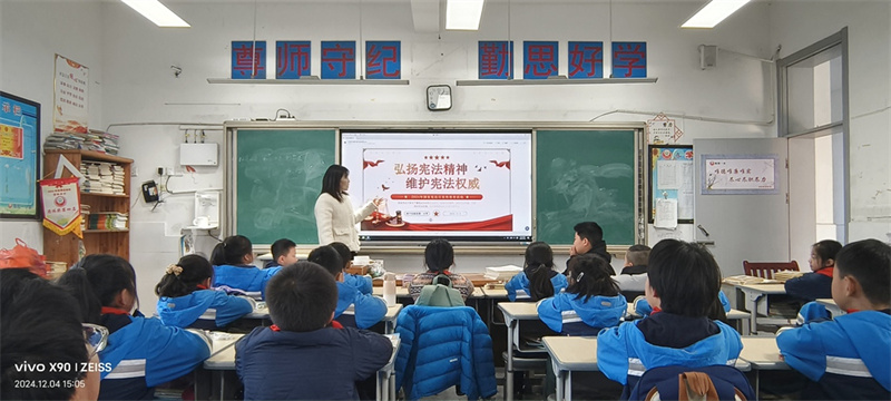 各班级开展的宪法班队课更是精彩纷呈。老师们借助精心制作的课件和生动有趣的视频案例并以互动讨论的形式,将宪法知识深入浅出地传授给学生。同学们积极参与其中,或发表自己对宪法条款的理解,或分享身边的法治小故事,课堂气氛十分活跃。