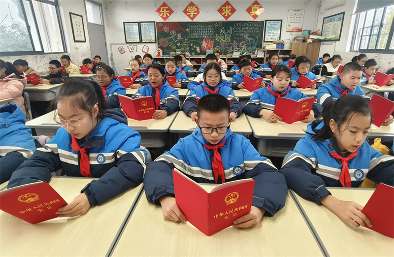 宪法晨读活动中,校园里书声琅琅。同学们在老师的带领下,齐声诵读宪法条文。那清脆而有力的声音,在校园的清晨回荡,让宪法的条文深深印入学生们的脑海,使他们对宪法有了更直观、更深刻的认识。