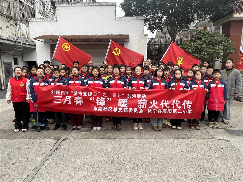 为弘扬雷锋精神,践行社会主义核心价值观,3月5日上午,休宁县海阳第二小学联合东湖社区党总支开展“三月春‘锋’暖 ,薪火代代传”学雷锋主题活动。党员教师、团员教师以及50名少先队员志愿者走进社区,以志愿清扫、慰问老党员等实际行动续写新时代雷锋故事。