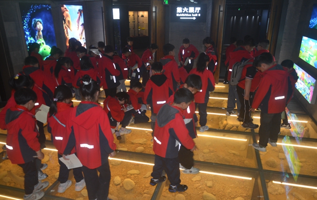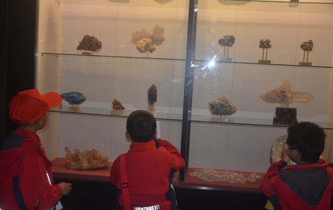 解码地球密码,感受矿物魅力。在地质矿石展区内,璀璨的水晶簇、斑斓的玛瑙原石和层理分明的地质剖面,让学生们直观了解地球亿万年的地质变迁。看到各类水晶岩在灯光照射下五彩的光影变化,孩子们连连称奇。"这块花岗岩和我们黄山的花岗岩地貌有什么联系?"面对学生的提问,讲解员结合乡土地质特征进行延伸讲解,深化知识迁移。