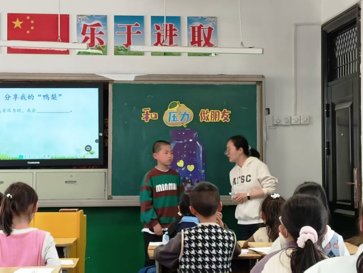 活动分授课、研讨两个阶段。活动开始,工作组成员方郑怡老师为富堨小学三(2)班同学讲授了《和“压力”做朋友》一课。方老师首先让学生说说生活中的“压力”,并告诉学生如果不想说,就把它画在“鸭梨”里,要是不知道怎么画,也可以在“鸭梨”上写字。学生们欣然接受了挑战。接着,方老师让学生说说面对自己的“压力”,是怎么想的,怎么做的,把它写在任务单上。然后,她让学生进行小组交流,汇报如何缓解压力。最后,方老师以自己面对工作压力的处理方法与学生交流,还分享了网球世界冠军郑钦文缓解压力的方式,让大家坚信:“压力我不怕,缓解有办法。”