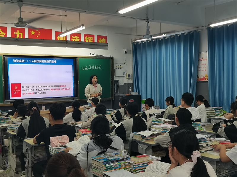 海阳二中程云芝老师执教的《国家司法机关》一课,以“模拟庭审”情境贯穿课堂,通过真实案例剖析、司法角色辩论等形式,生动诠释法律权威与社会公正。学生沉浸式体验司法流程,在思辨中深化法治信仰。