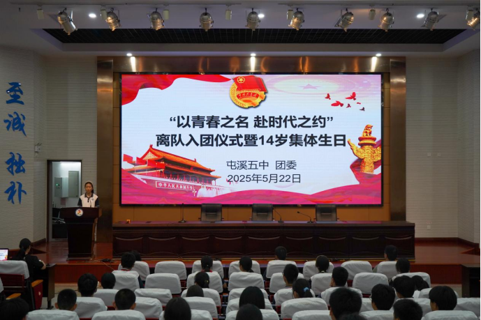 五月的阳光,辉映青春风采;激昂的旋律,激荡少年胸怀。5月22日下午,屯溪五中“以青春之名,赴时代之约”2025春季学期离队入团仪式暨14岁集体生日活动在校报告厅隆重举行。校党支部书记、校长张新宇,校专职副书记王效春,校团委书记张晶晶及其他团委老师出席活动,45名新团员与七年级少先队员代表共同见证这一青春成长的庄严时刻。