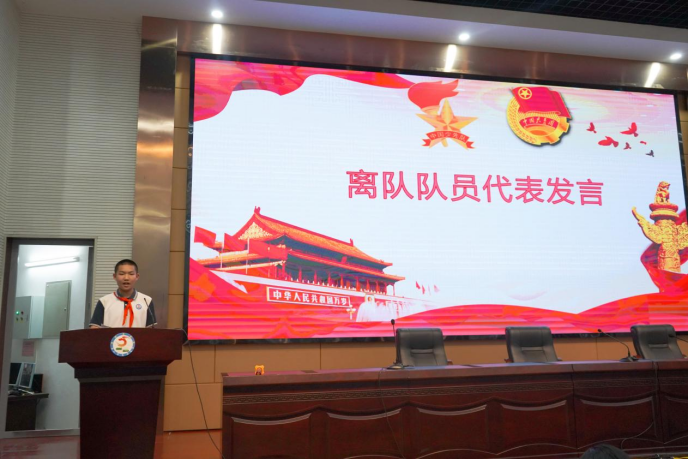 离队队员代表八(4)班孙文博同学发表感言,他回顾了红领巾陪伴成长的珍贵记忆并坚定表示,告别少先队不是终点,而是向共青团这一更高理想的奔赴。