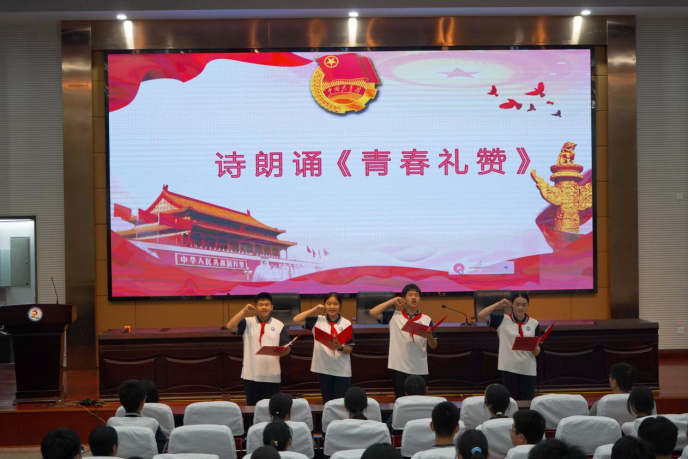 在离队与入团仪式的过渡环节,七年级少先队员代表以诗朗诵《青春礼赞》献礼新团员,用铿锵之声传递青春力量。