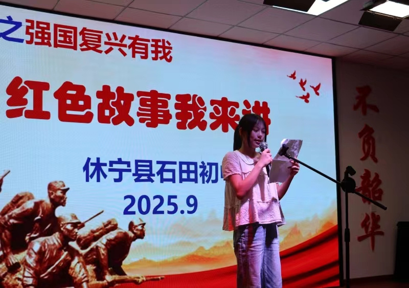 国庆前夕,为加强对学生进行红色教育,讲好红色故事,赓续红色基因,9月29日晚,休宁县石田初中在多媒体教室,举行“红色故事我来讲”演讲比赛,来自该各班选送的13名同学参加了比赛,全校师生观看了比赛。