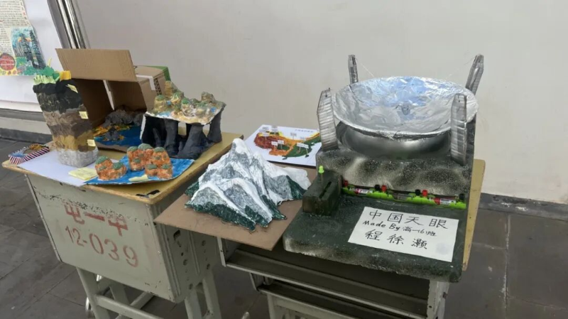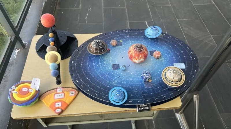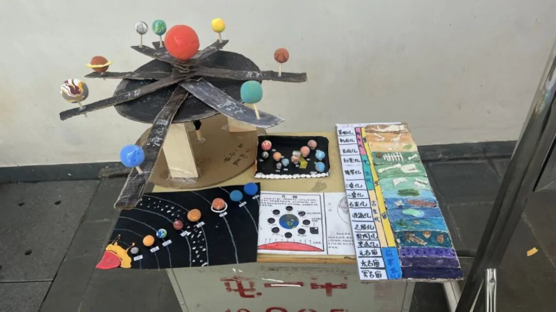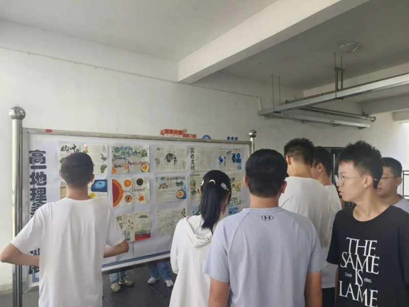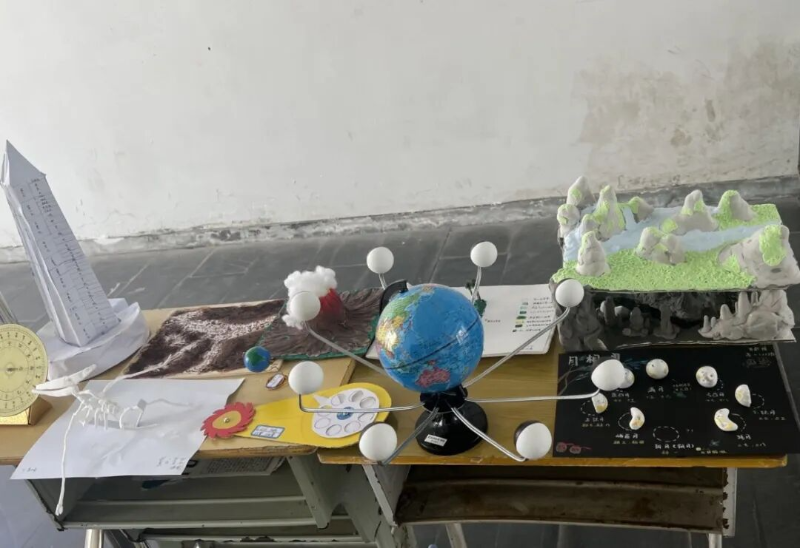 展览现场,作品形式多样、创意纷呈。既有拼贴而成的中国地形图,直观展示我国三大阶梯分布;也有精心绘制的地质年代图,阐释环境与生物的协同演化;更有同学利用废旧材料制作喀斯特地貌剖面图,将抽象地理原理化为触手可及的立体模型。每一件作品都凝结着同学们的智慧与汗水,体现了他们对知识的深入理解、出色的动手能力及深厚的家国情怀。