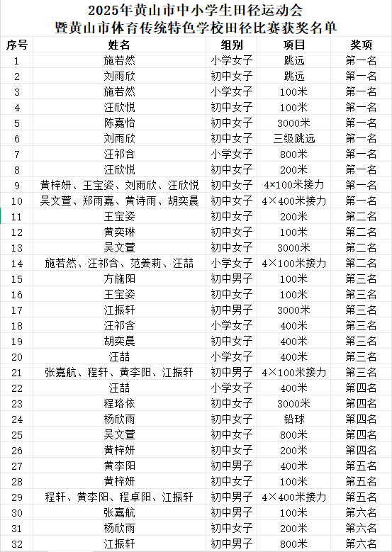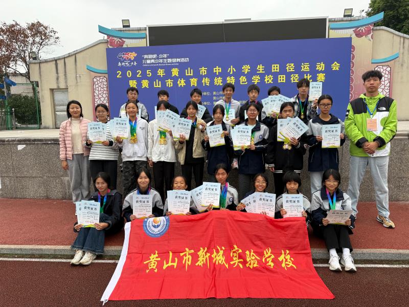 在2025年黄山市中小学生田径运动会暨体育传统特色学校田径比赛中,黄山市新城实验学校的运动健儿们在赛场上奋勇拼搏、屡创佳绩,共斩获10项冠军、4项亚军和7项季军,并取得5个第四名、3个第五名和3个第六名的优异成绩,奖牌总数喜人,展现出强大的整体实力。