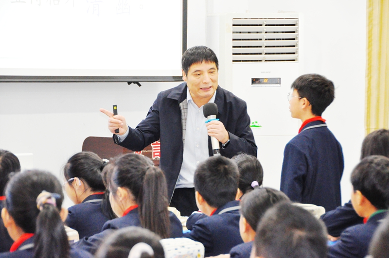 随后,特邀专家、江苏师范大学特聘教授孙庆博展示了示范课《月光曲》,并作微讲座《任务驱动型课堂的构建》。孙教授以“多层次阅读”为主线,运用幽默风趣的语言引导学生深入文本。他通过角色扮演式朗读,带领学生细致体会人物对话中蕴含的“知音”情谊,并着重指导学生通过想象朗读,沉浸于皮鞋匠聆听乐曲时产生的“月光照大海”经典画面联想。该课程设计让学生在琅琅书声与静心品读中,亲历“理解内容、感悟情感、学习联想、赏析写法”的全过程,深刻领悟“语言文字如何描绘无形音乐”的精妙之处,扎实提升语文素养。