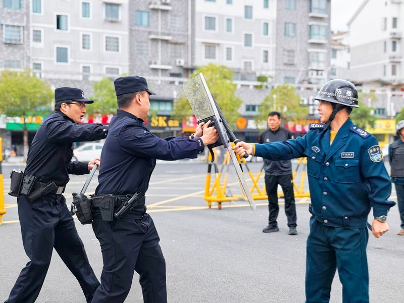 碧阳派出所工作人员详细讲解了防暴盾牌、钢叉、橡胶棍等装备的功能与使用要点,通过分解动作示范,让教师和保安们清晰掌握操作技巧。