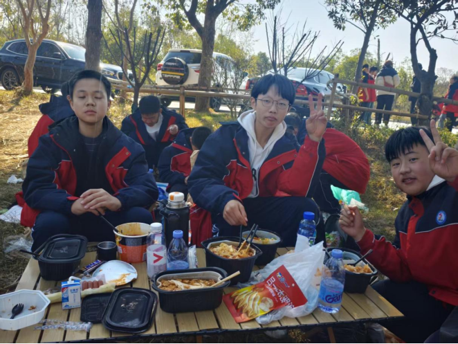 历经近3小时跋涉,队伍顺利抵达汉沙河滩。在导师们的默契配合下,野餐环节有序展开。同学们分组围坐,有的同学分享自带的徽州特色美食——黄山烧饼,大家边品尝边交流沿途见闻,首席导师们与孩子们交流学习上的烦恼与收获,第一导师则全程陪伴,做好后勤服务,用自己的爱和付出,在此刻与孩子们共情。