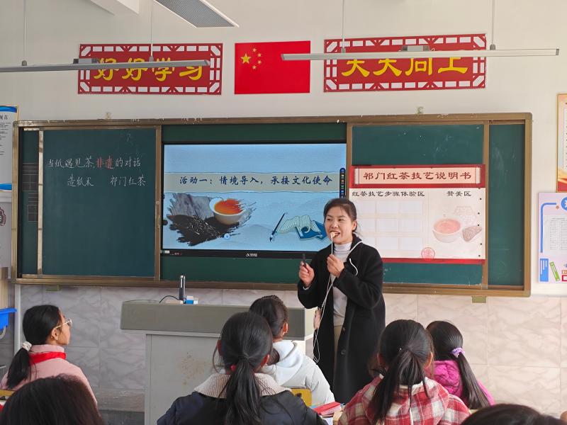阊江小学教师余婷婷展示《当纸遇见茶,非遗的对话》跨学科主题教学课。她围绕“招募祁红小茶人讲解员”核心任务驱动构建清晰主线,串联起“学习造纸术讲解方法——迁移梳理祁门红茶制作工序——设计祁红文创包装”教学流程,引导学生从“非遗文化学习者”转变为“非遗文化传播者”,在文创包装设计环节提出“传统元素+时尚设计”的要求,既坚守非遗文化内核,又贴合当代青少年审美,让传统文化传承更具生命力和时代感。课堂中体现的校本课程理念与跨学科思维,充分凸显导师团队在课程开发方面的引领作用。观课议课环节,两校结对导师与青年教师围绕课堂实施、素养落实、教学策略等进行深度对话,畅所欲言形成良好的导学互动氛围,实现“以导促研、以研促教”目标。