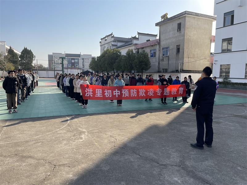 12月1日上午,洪里初中特邀商山镇派出所秦警官走进校园,以“拒绝校园欺凌,守护青春成长”为主题开展防欺凌法治宣传活动,这也是学校“导--师--制”体制中社会导师进校园赋能的重要实践,为师生们带来了一堂生动实用的法治安全教育课。