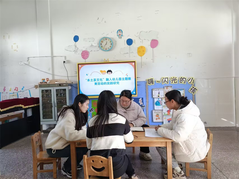 小班教师代表提出:“小班幼儿适合开展简易手工创作,我们可以利用干燥茶叶的天然形态和颜色,设计‘茶叶粘贴画’活动,让孩子用胶水将茶叶粘贴成小草、花朵等简单图案,在操作中感受茶叶的质感与色彩美。”中班教师团队则聚焦绘画与本土元素结合,分享道:“我们计划结合家乡茶园的实景,引导幼儿观察茶树的枝叶形态、茶园的层次布局,开展‘水墨茶田’绘画活动,用棉签、毛笔等工具绘制心目中的茶园,同时融入本土茶田的独特景致。”大班教师则探索多元创作形式,设计了“创意茶具DIY”活动:“我们会提供黏土、彩纸、颜料等材料,让幼儿模仿本土传统茶具的造型,自主设计制作专属茶具,还可以在茶具上绘制茶俗图案、家乡地标等元素,既锻炼动手能力,又深化对本土茶文化的认知。”研讨中,教师们还就材料选择的安全性、创作难度的适宜性、茶文化内涵的自然渗透等问题进行了深入交流,进一步完善了活动方案。