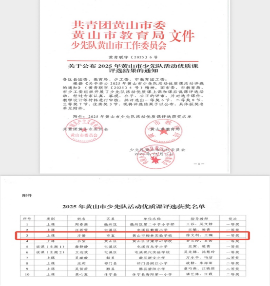 近日,黄山市少先队优质课评比活动圆满落幕。黄山市梅林实验学校方倩老师凭借扎实的教学功底、创新的活动设计和深刻的思想引领,在2025年黄山市少先队活动优质课评选中脱颖而出,斩获一等奖。