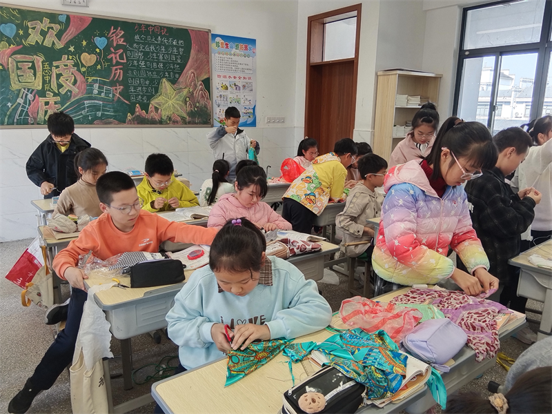 制作过程中,“导-师-制+”的精准指导优势尽显。主导师穿梭在各组之间,针对课文中“缝制口袋要留袋口”“铁丝固定需缠2-3圈”等关键知识点,结合实操中的难点手把手教学:遇到穿针引线不熟练的孩子,就放慢节奏示范基础针法;对“风向判断原理”理解模糊的学生,用“风推着袋子跑,袋口对着风来的方向”的通俗比喻答疑。小导师们则发挥“同伴优势”,有的协助校准袋口铁丝弧度,有的分享让风向袋更轻盈的小窍门,还会提醒同伴对照课文检查步骤是否遗漏。孩子们一边对照课本研读说明文字,一边动手裁剪、缝制、固定,在“读-做-思”的闭环中,不仅掌握了风向袋的制作技巧,更读懂了说明文“按顺序、列数字”的表达奥秘。