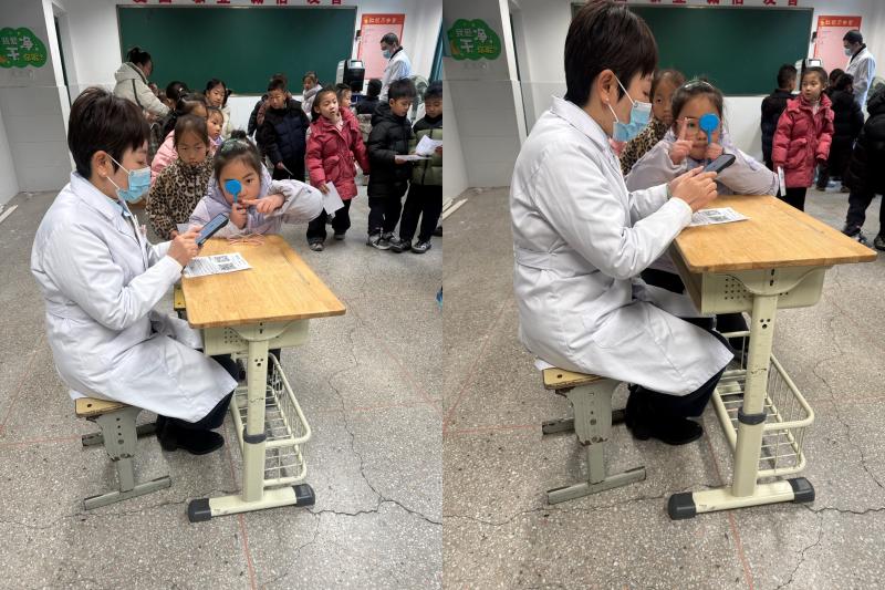 检测现场,黄山市爱尔眼科医院的医护人员携带专业检测设备,耐心细致地为每一位学生进行视力检查。他们严格按照检测标准,逐一记录学生的视力数据,同时针对部分视力异常的学生,详细询问日常用眼习惯,并向学生和陪同的班主任讲解近视防控的基本常识,提醒孩子们要养成正确的读写姿势、控制电子产品使用时间、坚持做眼保健操、多参与户外活动等,帮助孩子们树立科学的护眼意识。