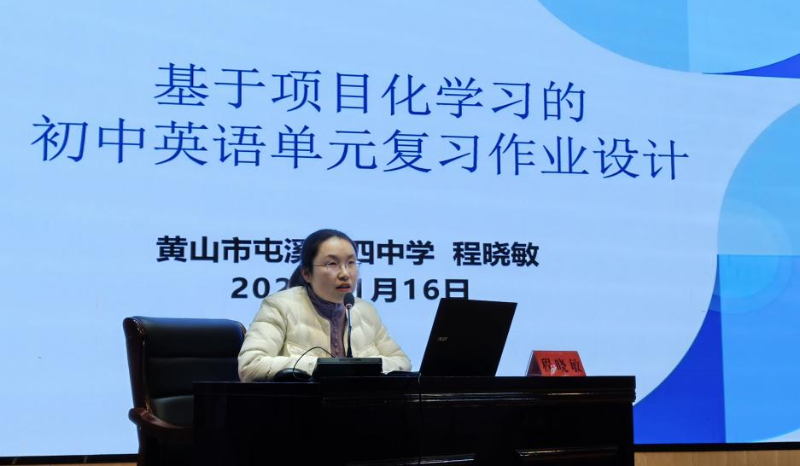 在下午的专题研讨环节,课题组核心成员程晓敏老师围绕市级教科研课题(编号JYKT202510392)《基于项目化学习的初中英语单元复习作业设计》,作阶段性成果专题讲座。程老师结合课题组在本校的教学实践,系统剖析了项目化作业的设计逻辑、实施要点与评价体系,分享了课题研究中“从理论到实践”的探索历程与创新思考,并通过视频、图文等形式,展示了屯溪四中学生在项目化学习中展现的自主探究热情与精彩成果,其翔实的案例、实用的方法获得与会教师广泛认可,为全市英语教师开展项目化教学提供了宝贵经验。