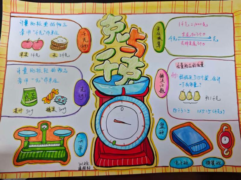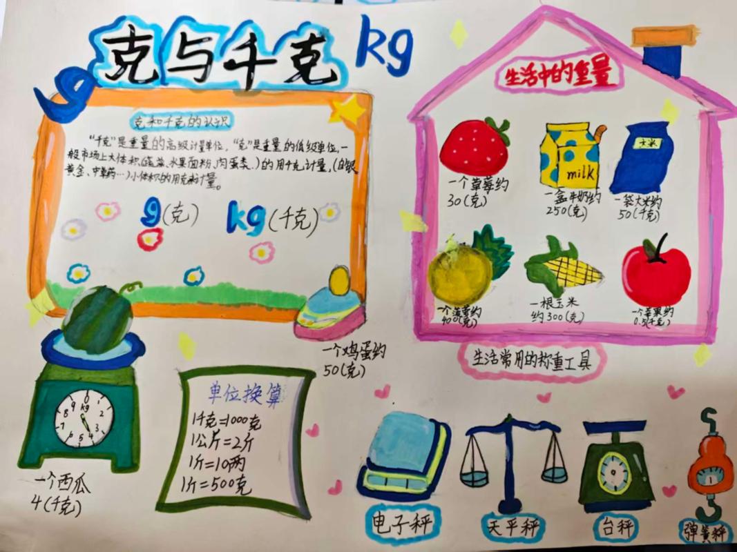 本次活动鼓励学生将实践成果与创意表达相结合,同学们纷纷开启“生活大搜索”,通过掂一掂、称一称、记一记的方式,寻找1克、1千克、1斤、1磅对应的实物案例,用生动的简笔画搭配精准表格,将抽象的质量单位与熟悉的生活用品紧密关联,让数据变得直观易懂。有的同学通过查阅资料,对比了“斤”“两”等中国传统质量单位与“克”“千克”国际单位的异同,发现古代质量单位的起源与生活生产密切相关,而现代单位更注重精准统一;有的同学总结了中外单位换算的小技巧,比如记住“1千克=2斤”,并设计了简单的换算口诀;还有的同学分析了不同测量工具的优缺点,认为电子秤精准快捷但依赖电力,杆秤便携耐用但需要技巧,弹簧秤操作简单却容易有误差。这些充满个性的思考,彰显了实践活动对学生数学思维的培养。