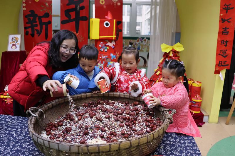 除尘纳福迎新年。清晨,孩子们将自家带来的杂粮轻轻倒入筛箩和木桶,一粒粒小米、红豆、花生、莲子汇聚成“福气粮仓”。教师通过绘本《腊八的故事》、童谣《腊八歌》以及手工制作《腊八粥》《腊八蒜》等活动,带孩子感受“过了腊八就是年”的习俗魅力。最热闹的当属“快乐除尘大作战”,小小“除尘员”们头戴纸帽、身穿围裙,擦桌椅、理柜子、洗玩具、清垃圾,忙得不亦乐乎。孩子们品尝着“百家米”熬成的腊八粥,暖意融融,“劳动真甜”写满每张笑脸。