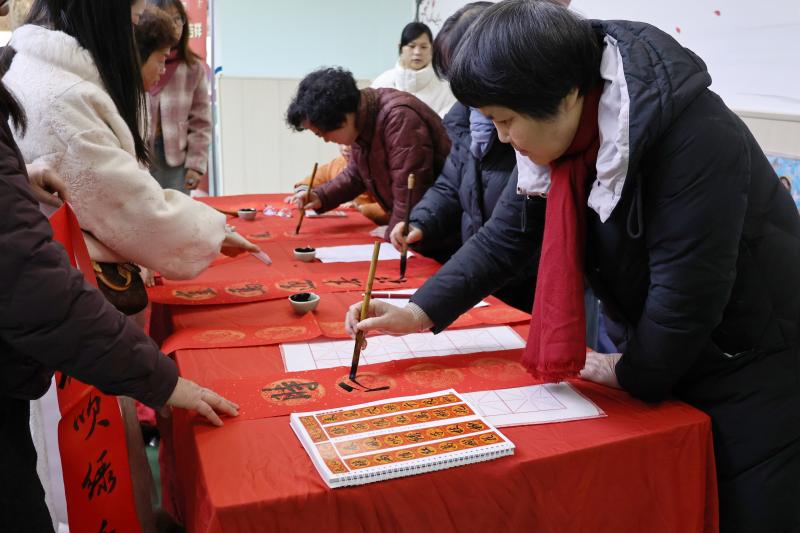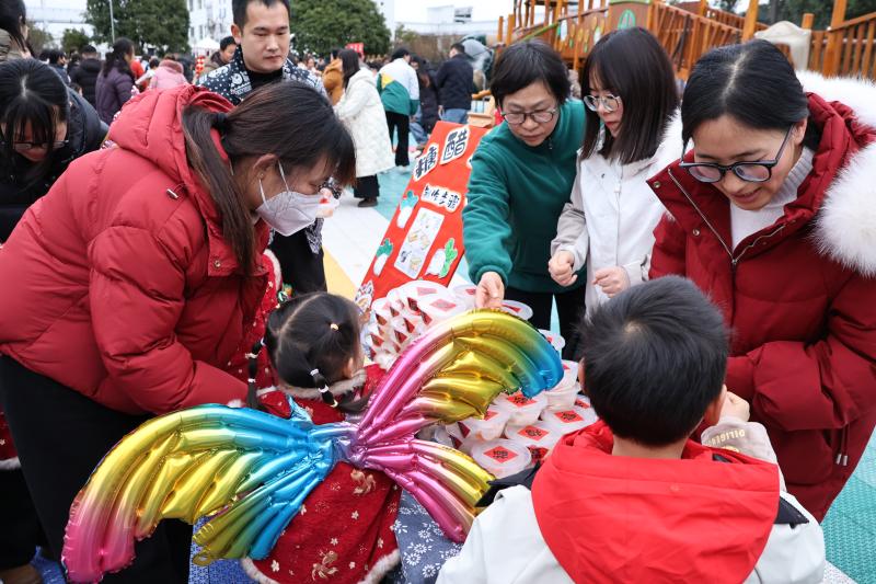 萌娃赶集乐翻天。下午,随着二十四节气鼓和铜锣声铿锵响起,“茶宝超市”正式开业!年货街区里,各班“摊位”前人头攒动:梨膏棒棒糖、糖画、爆米花、糯米糍粑、苞芦松、瓜子、花生等传统小吃让宝贝们挪不开脚;扎染布艺、石头奇妙屋、手串DIY等手工作品吸引顾客们驻足;灯笼、窗花、“福”字拓印等年货摊位更是年味儿十足。县青少年活动中心的书法老师现场书写对联,送上新春祝福。活动尾声,每个家庭都收到一份特殊伴手礼——装有腊八当天汇聚的“百家米”小福袋,把“福”气与温情一起带回家。