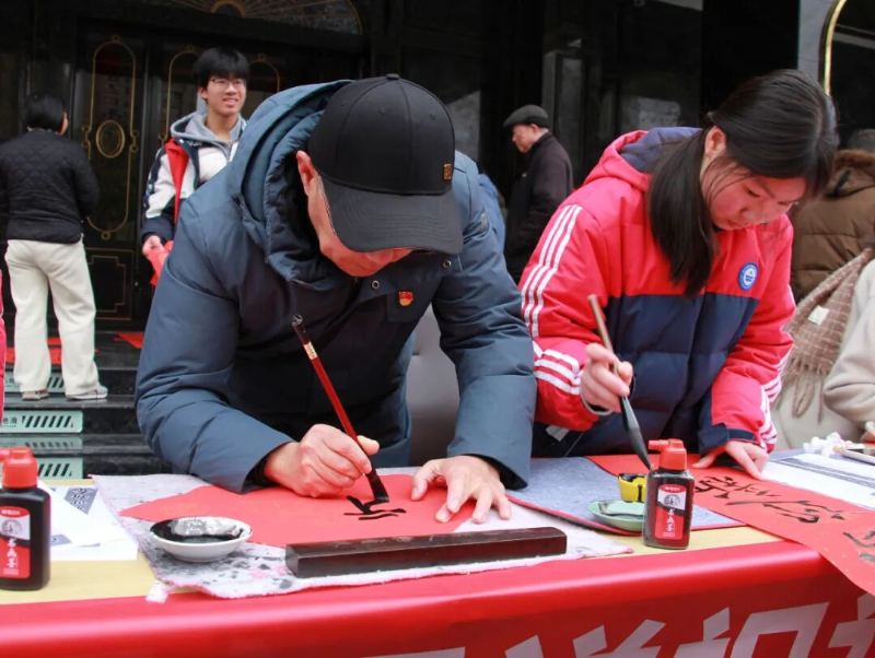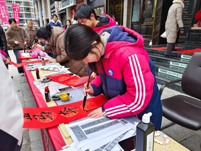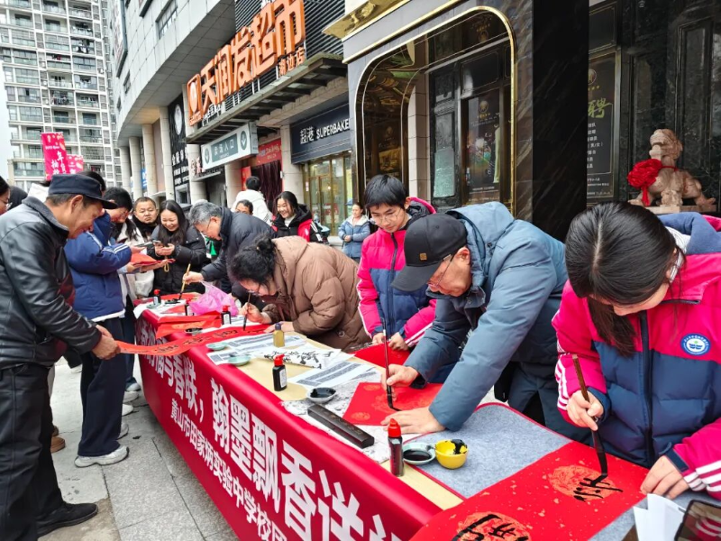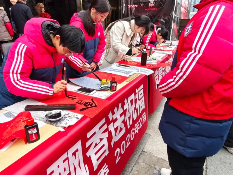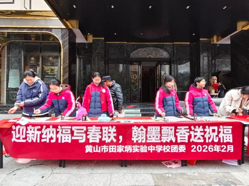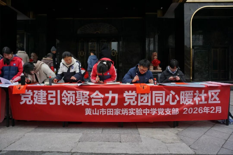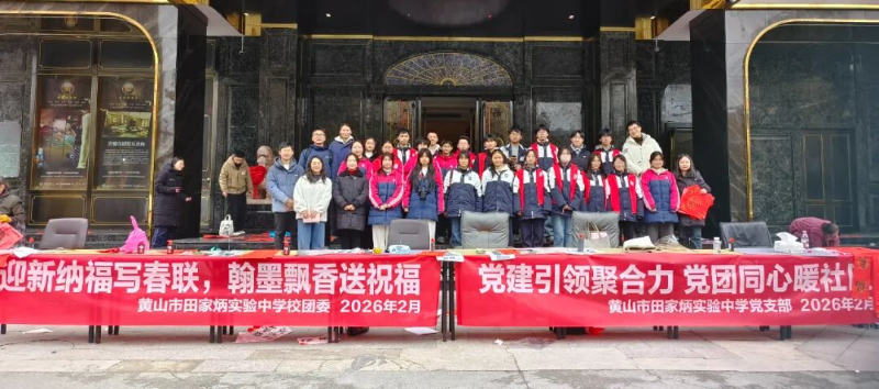 律回春渐,福启新程。为深入贯彻党建引领基层治理的重要精神,充分发挥校社党组织战斗堡垒作用与党员先锋模范作用,推动党团共建与育人实践深度融合,2月7日下午,黄山市田家炳实验中学联合湖边社区,于湖边商城广场开展“翰墨迎新春,党建暖民心”校社联动志愿服务活动。活动以“导-师-制+”为抓手,将文化传承、便民服务与导师育人有机结合,为社区居民送去新春的温暖与关怀。