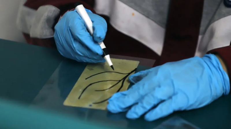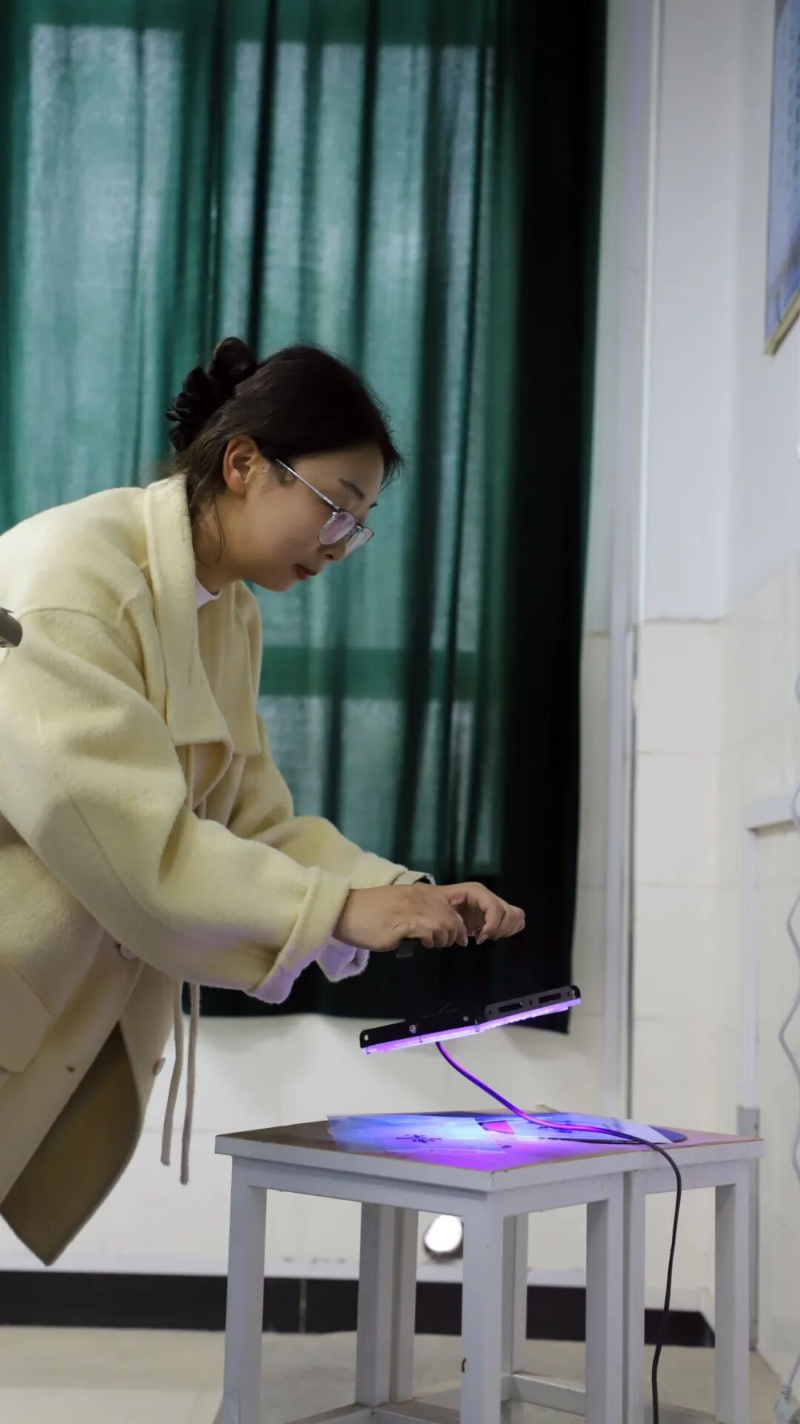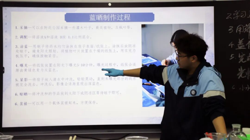 戴上手套,调配蓝晒药水并均匀涂刷于纸张;在透明菲林纸上精心书写文字与创意图案,将其覆盖在涂好药水的纸张上;置于科研社提前准备好的紫外线灯下照射曝光,再放入清水中冲洗显影……同学们在科研社成员的专业协助下,有条不紊地完成每一步操作。