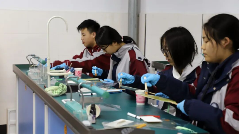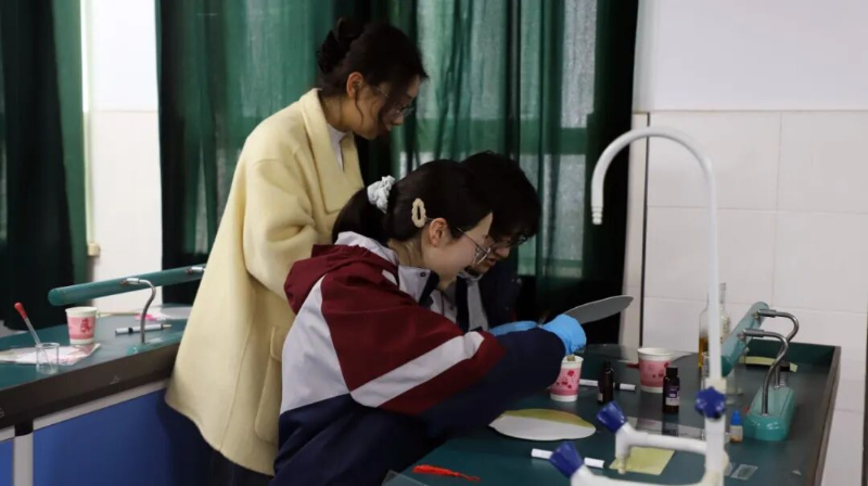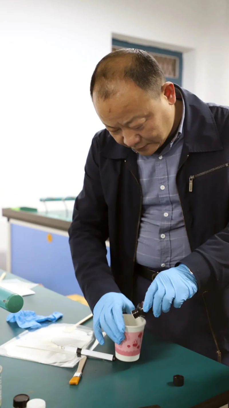 活动过程中,科研社的同学们充分发挥“导-师-制+“模式下的同伴引领作用,主动下场指导,穿梭于各个小组之间,细致讲解操作步骤,耐心解答操作疑问,手把手协助大家完成药水调配、均匀涂刷等关键环节,为活动顺利开展提供了有力保障。社团指导老师朱孝帅老师也全程亲临现场,悉心把控操作规范,针对细节问题逐一点拨,为同学们的实践操作保驾护航。