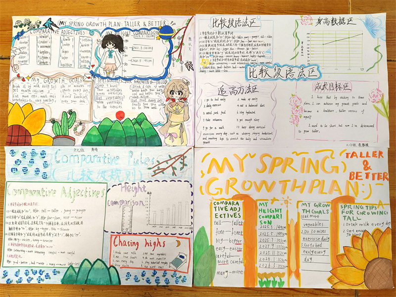 最终,学生们以小组为单位制作《春日追高计划海报》,将身高数据、追高方法与英语比较级句型融为一体,创作出兼具知识性与创意的作品。活动还设置了“追高小能手”“最佳表达奖”“创意设计奖”,鼓励学生在跨学科实践中展现风采。