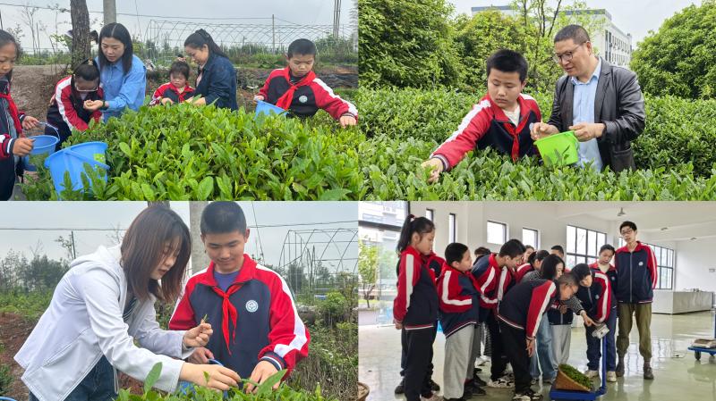 绘本阅读结束后,采茶实践环节正式启动。茶研所工作人员化身“茶技导师”,带领学生漫步茶园,细致讲解春茶的生长特点、采摘标准,亲手示范“一芽一叶”的标准采茶动作,耐心指导学生分辨茶芽、掌握采摘技巧。教师与工作人员以“陪伴导师”身份,实行一对一结对帮扶,手把手协助每一位学生完成采茶操作,帮助学生克服操作困难,在亲手采摘的过程中,感受劳动的快乐与收获的喜悦。采茶结束后,学生们带着自己的劳动成果参与鲜叶称重环节,“茶技导师”借助精准的称重工具,让学生亲手称量采摘的鲜叶,在直观操作中感知数量差异,同时培养学生的劳动成就感。