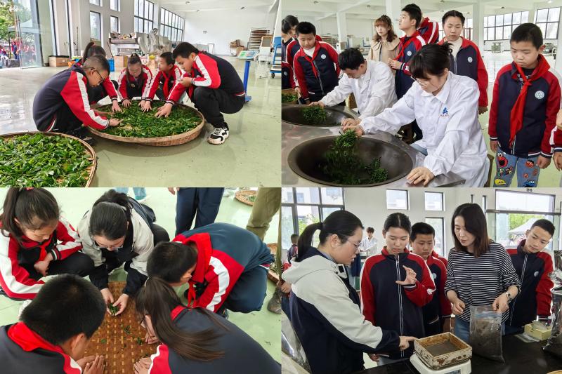 随后,学生们集中观摩制茶全过程。“茶技导师”结合春茶加工特点,详细讲解摊晾、杀青、揉捻、烘干等制茶关键工序;其中摊晾和揉捻环节,在“茶技导师”与“陪伴导师”的共同指导下,学生们亲手参与操作,近距离感受制茶的细节与乐趣。通过观摩与实操结合,让学生直观了解茶叶从鲜叶到成品的形态、色泽变化,感受传统制茶工艺的魅力,深化对茶产业的认知。制茶结束后,称重装袋环节有序开展,导师们协同指导,带领学生将成品茶叶称重、装袋、密封,既让学生体验到完整的茶事流程,也培养了学生的动手能力与收纳意识,让每一份劳动成果都得到妥善留存。