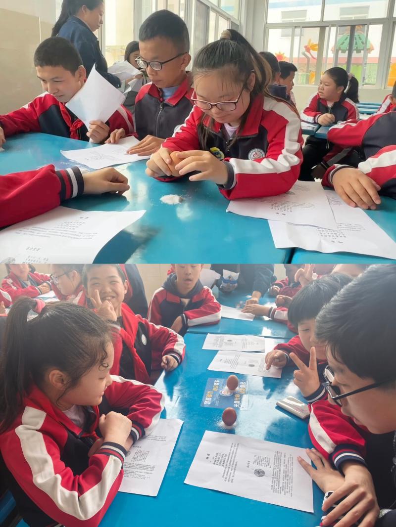 活动尾声,竖蛋祈福环节温情上演。教师结合绘本《春天很高兴认识你》中的春日民俗,以故事化口吻为学生讲解春分竖蛋“祈福平安、吉祥如意”的传统寓意。随后,工作人员为每位学生分发1枚生鸡蛋并预留备用,提供少量食用盐辅助竖蛋,全程陪伴鼓励,引导学生积极尝试,现场氛围温馨融洽。